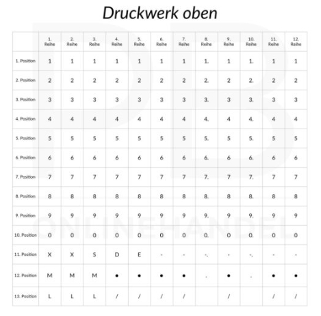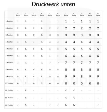 2-zeilig, 12 Zahlen oben und 11 unten von 0 - 9, mit Komma